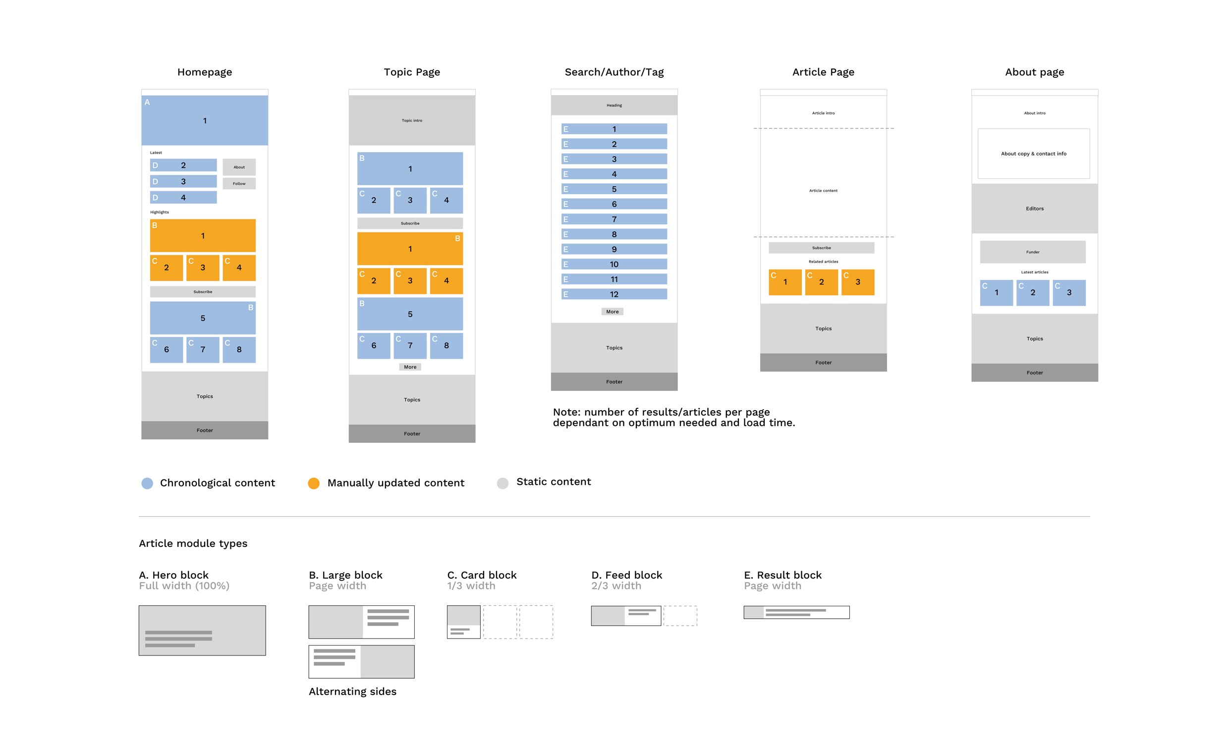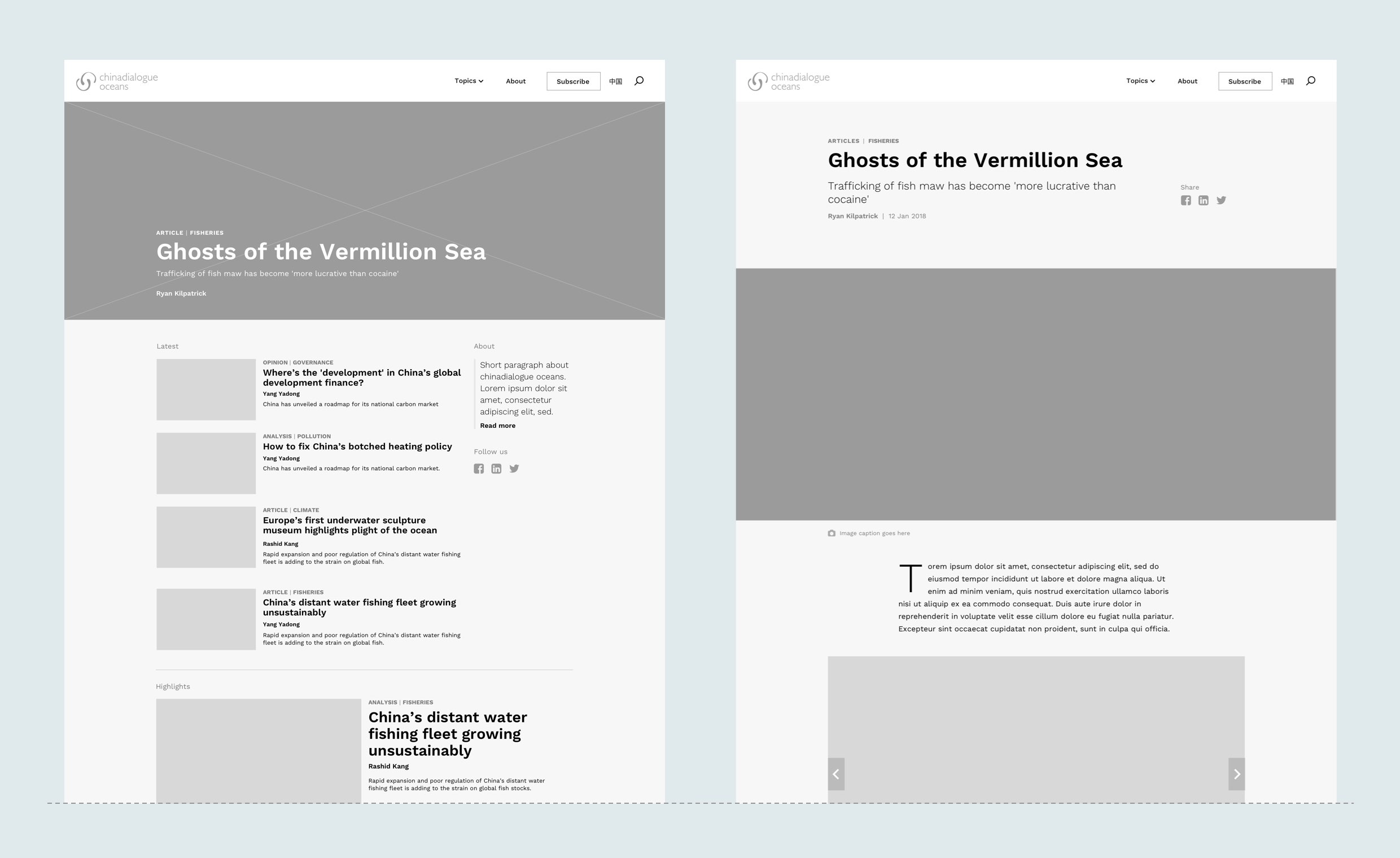 Working in short sprints, the aim was to produce wireframe prototypes to test the effectiveness of the navigation and layout across desktop and mobile before going into visual design. This enabled us to define the hierarchy of the homepage and article modules clearly, and informed an intuitive and easy to navigate experience. After the wireframes were complete, the task was then to produce a digital-first brand look and feel that stemmed from the original chinadialogue brand, yet felt unique and relevant to the ocean-specific content.