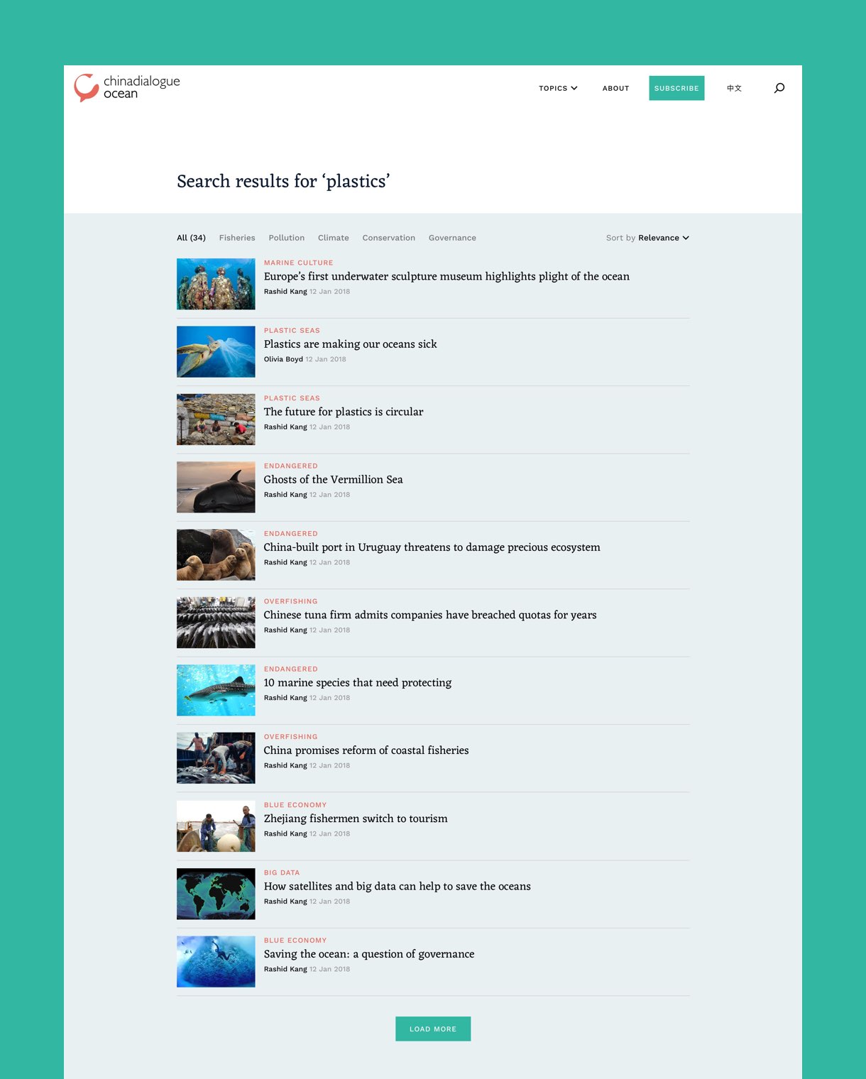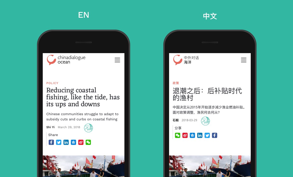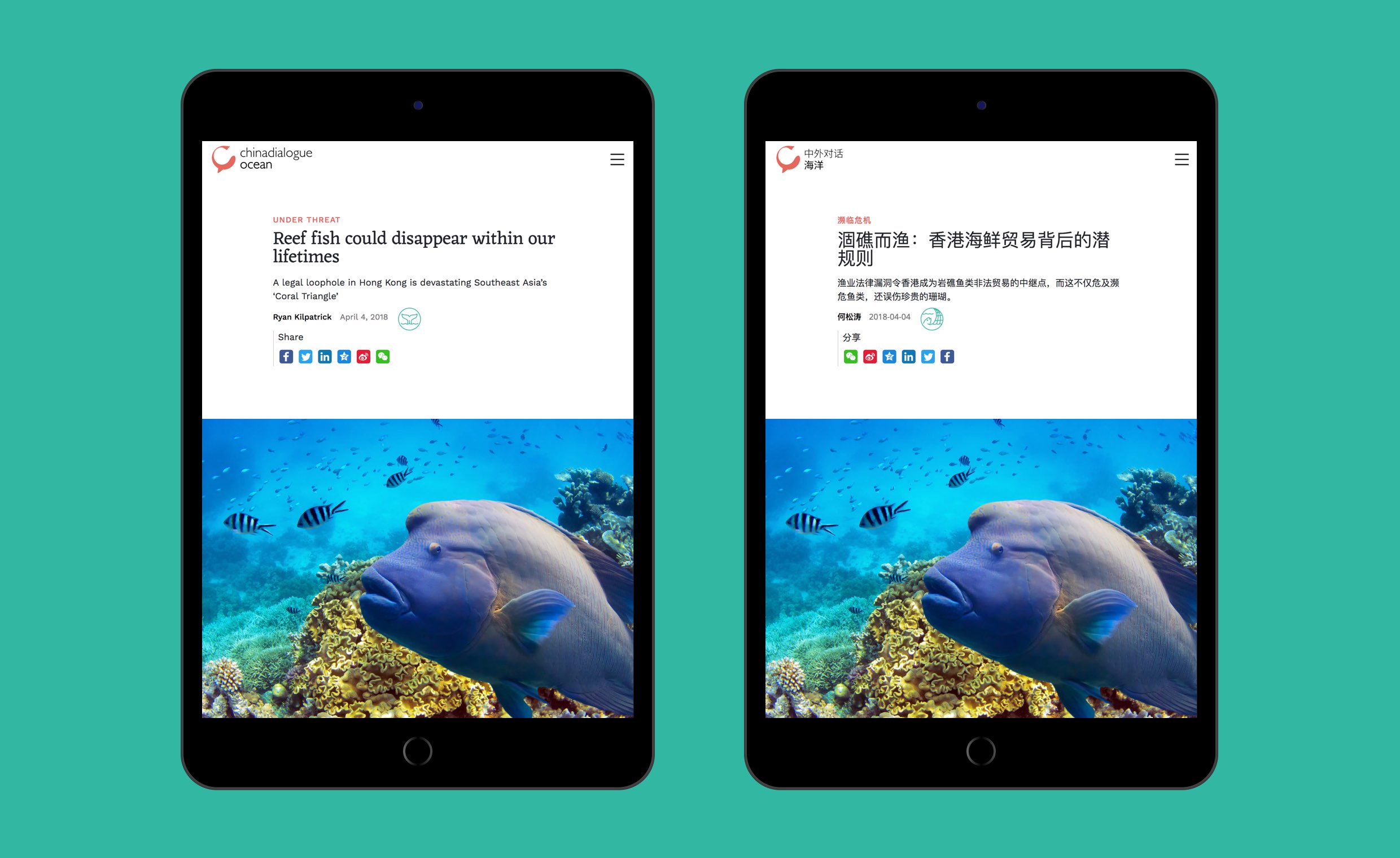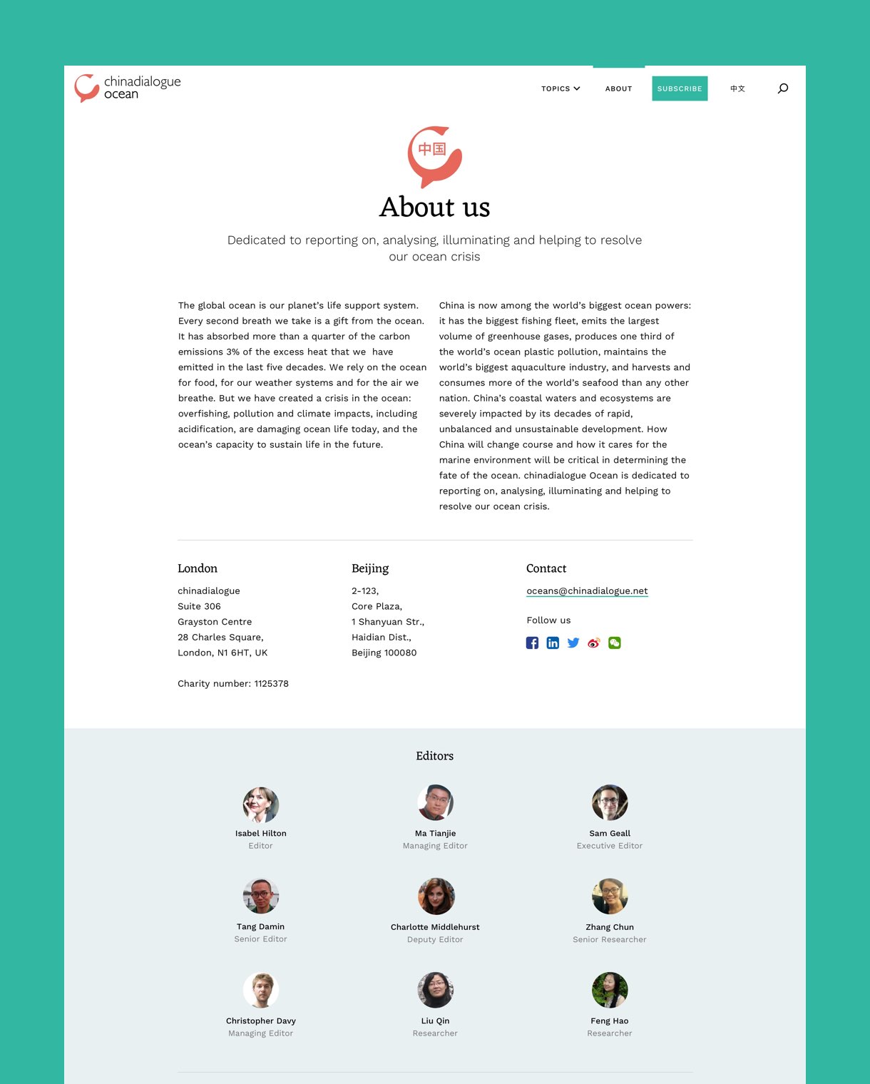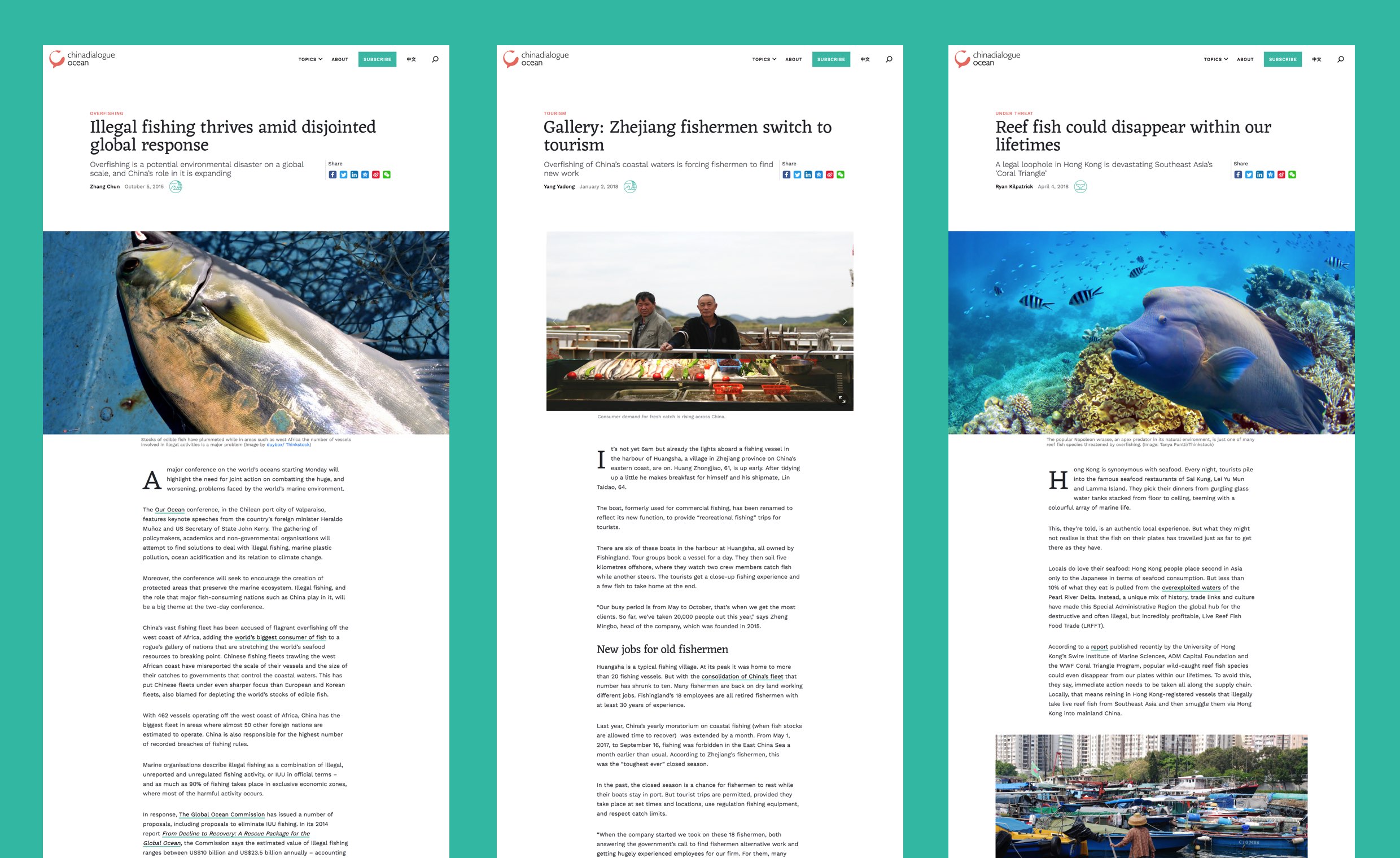 The brief was to design a bilingual news website for chinadialogue that focused on ocean-specific content, highlighting the devastating impact humans are having on our seas. A new brand needed to be created as well as a responsive site design that showcased articles in an engaging and impactful way. Working closely with the team at chinadialogue I was able to clearly define the design proposal from the start, and working under a short timeframe produce a clear process to tackle the site and branding challenges ahead.