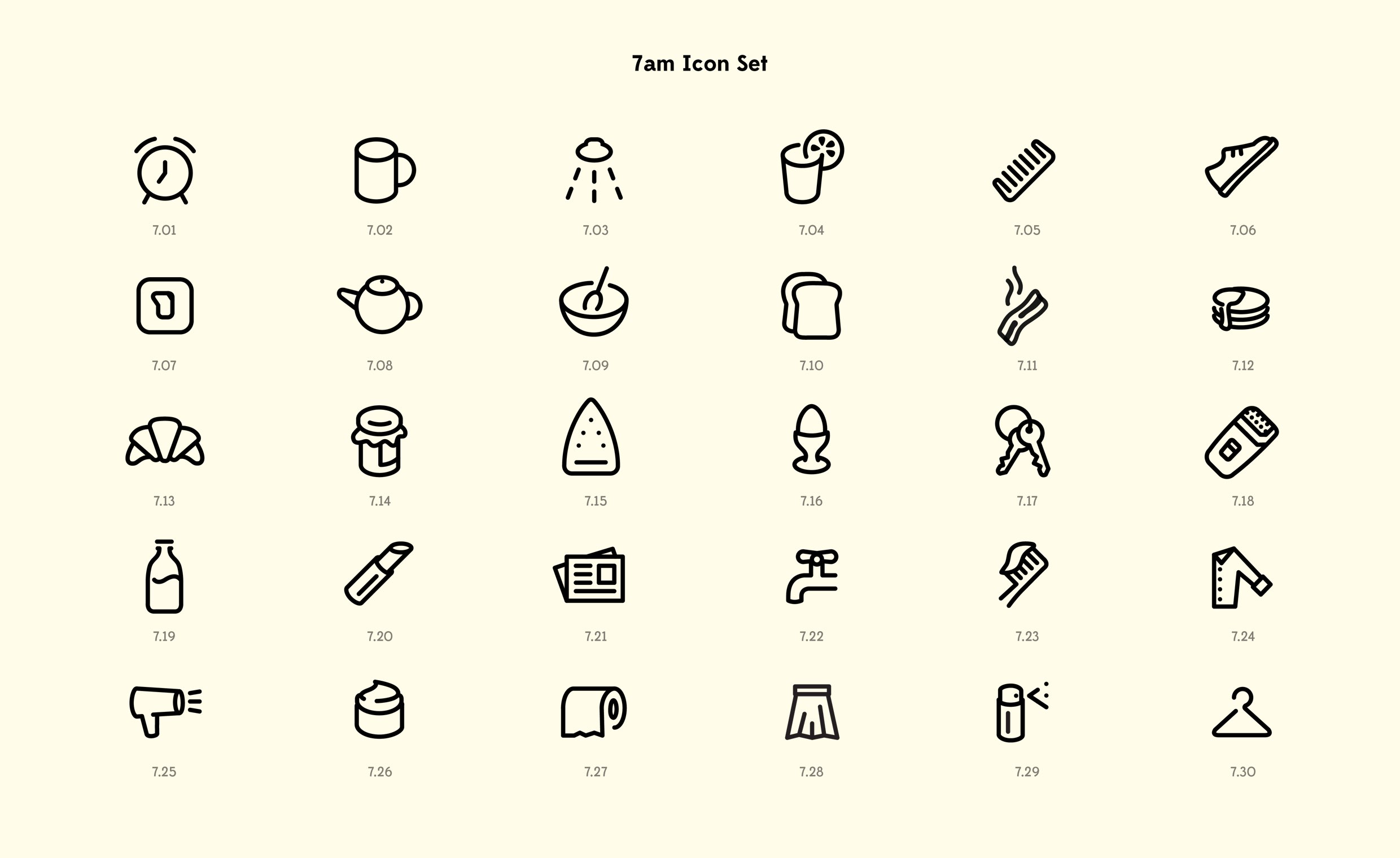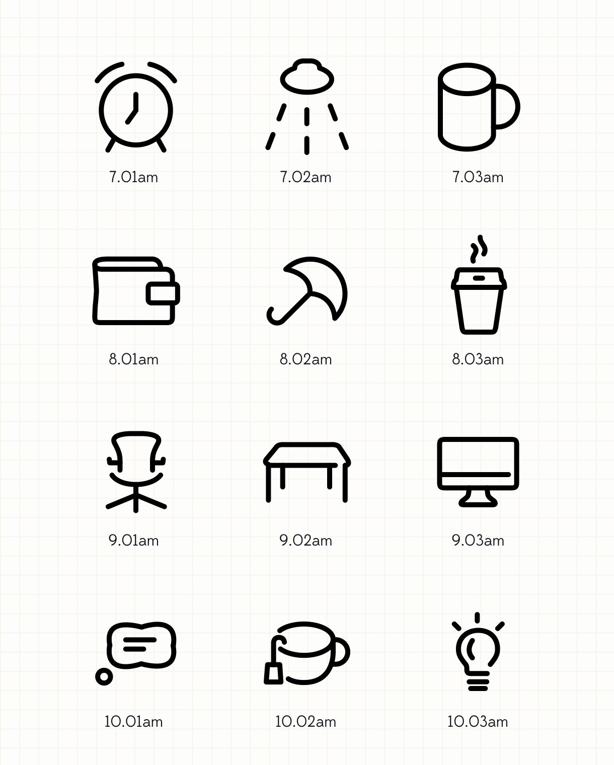 Icons by Hour is a self-initiated project that explores iconography in relation to time. The aim of the project was to give myself a platform to refine my craft in icon design by documenting everyday objects and actions in a simple visual form. The concept of the project is based on chronology; each minute of the day is represented by an icon contextual to that specific time. The icons form a visual narrative, giving a flow that represents a day in the life minute by minute.